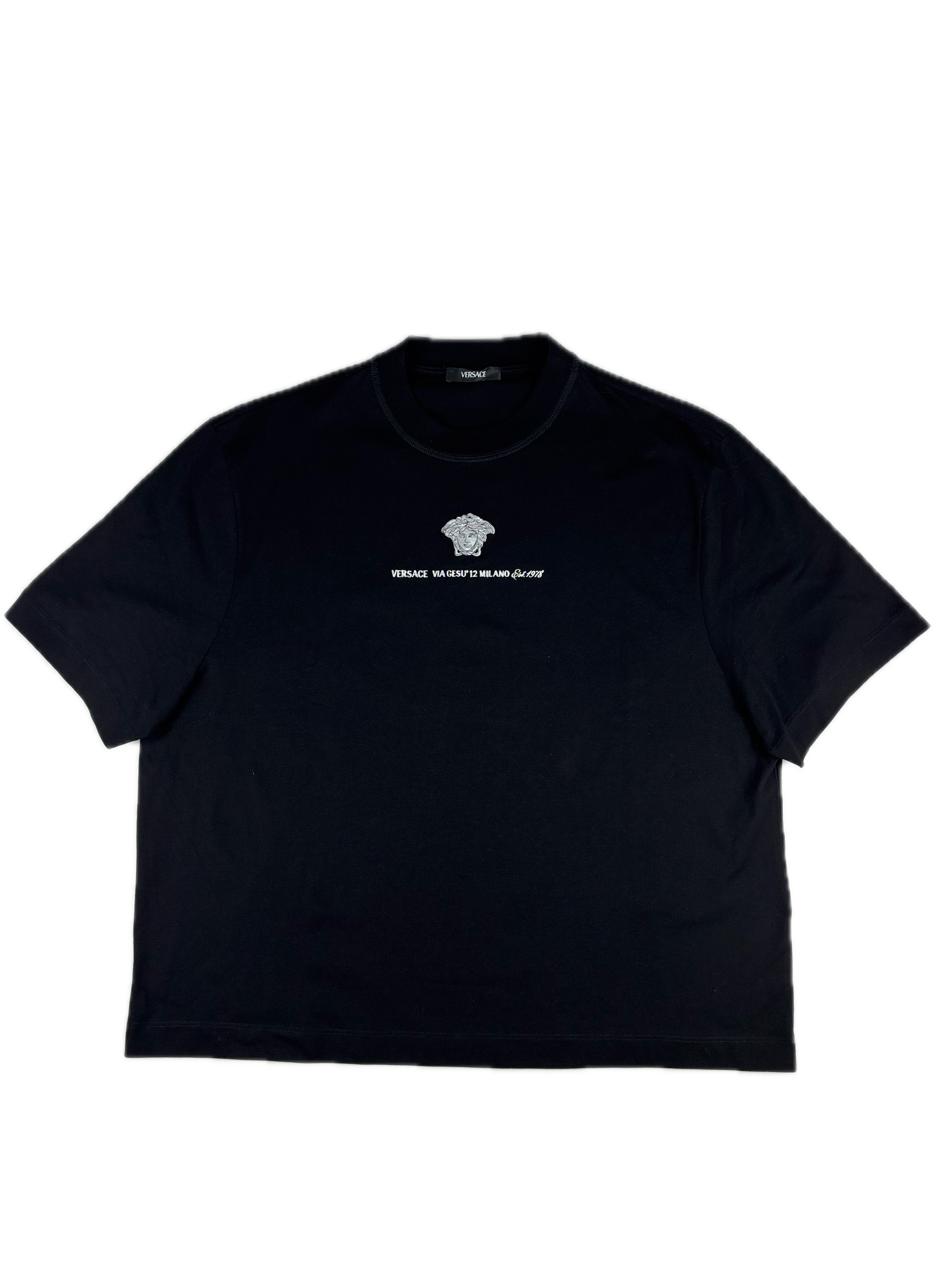 Top crafted in cotton. Features Medusa embroidery, a classic cut, and short sleeves.